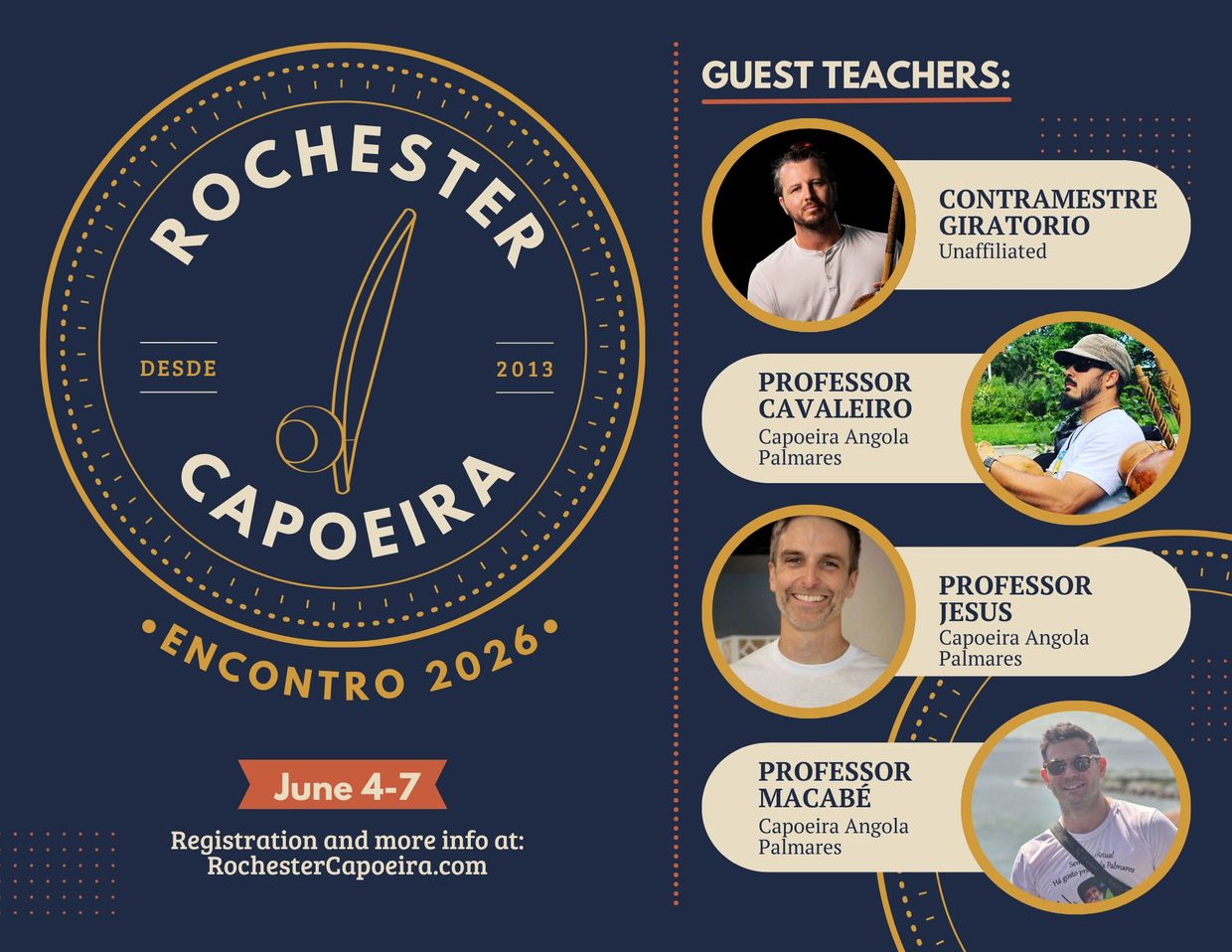 Join us in Rochester for a weekend of capoeira, community, and connection at our 2026 Encontro. From June 4–7, we’ll gather with guest teachers and friends from near and far to train, play, and deepen our understanding of this rich Afro-Brazilian art form.
